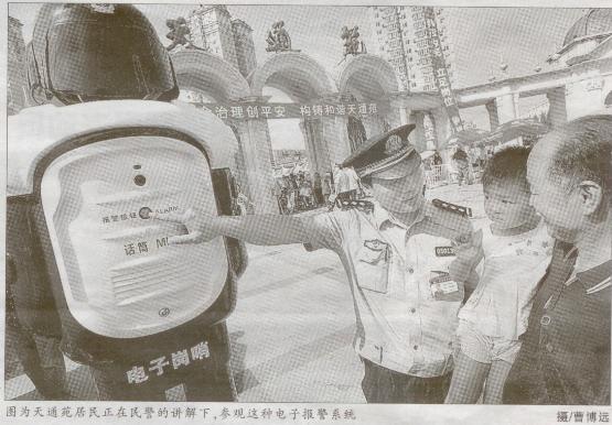 本报讯(记者 洪雪)今日上午,天通苑派出所进行了派出所建成后的第一次平安宣传活动。一种新型电子报警系统最吸引眼球。据悉,这种外形像机器人的电子报警系统不久有望在天通苑地区安装。
