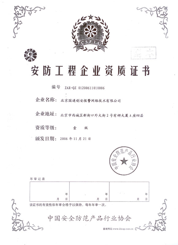 国通创安荣获安防工程企业一级资质